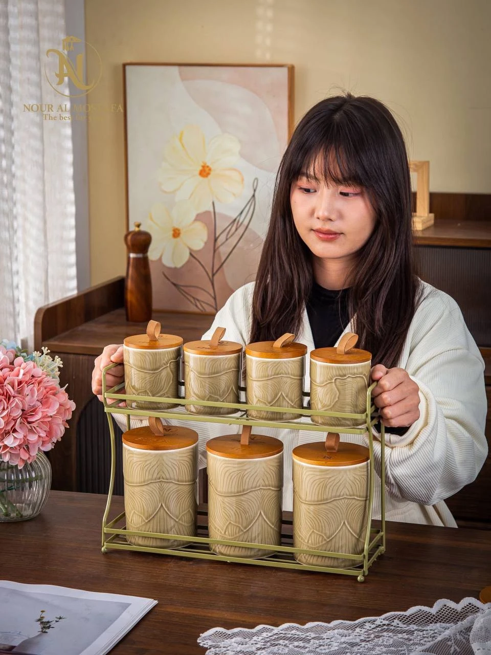 ✔️ طقم متكامل من علب التوابل بغطاء خشبي أنيق وسهل الاستخدام.